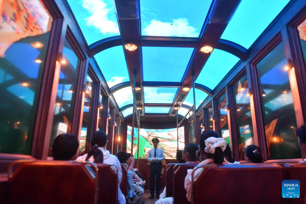 Primary school students listen to the narrator inside a digital tram on Zhongshan Road of Qingdao City, east China's Shandong Province, on July 6, 2025. Students across the country are enriching their summer vacations through colorful activities. (Photo by Wang Haibin/Xinhua)