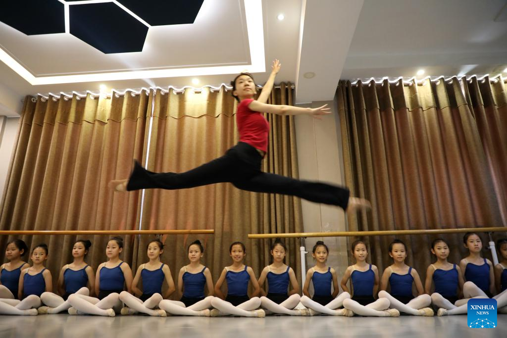 A teacher demonstrates dance moves for children at a dance training school in Boxing County of Binzhou City, east China's Shandong Province, on July 5, 2025. Students across the country are enriching their summer vacations through colorful activities. (Photo by Chen Bin/Xinhua)