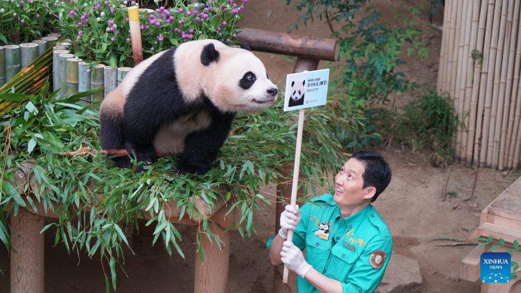Giant panda twin Rui Bao interacts with its keeper during a celebration for the twins' second birthday at Everland Resort in Yongin, South Korea, July 7, 2025. The giant panda twins Rui Bao and Hui Bao celebrated their second birthday here on Monday.
