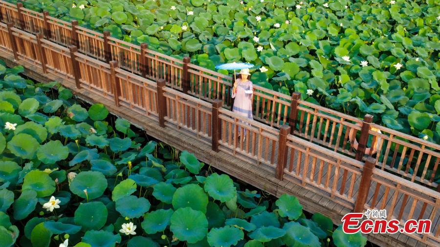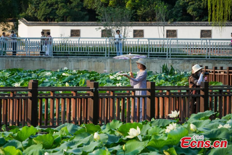 Citizens enjoy blooming lotus flowers along the viewing walkway at Zijingshan Park of Zhengzhou City in central China's Henan Province on July 7, 2025. (Photo/China News Service)