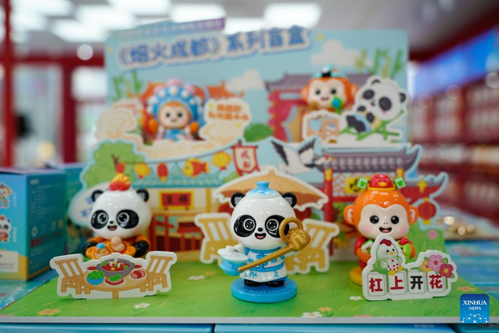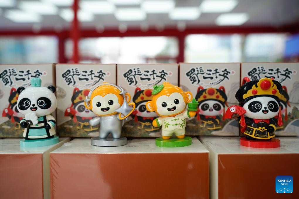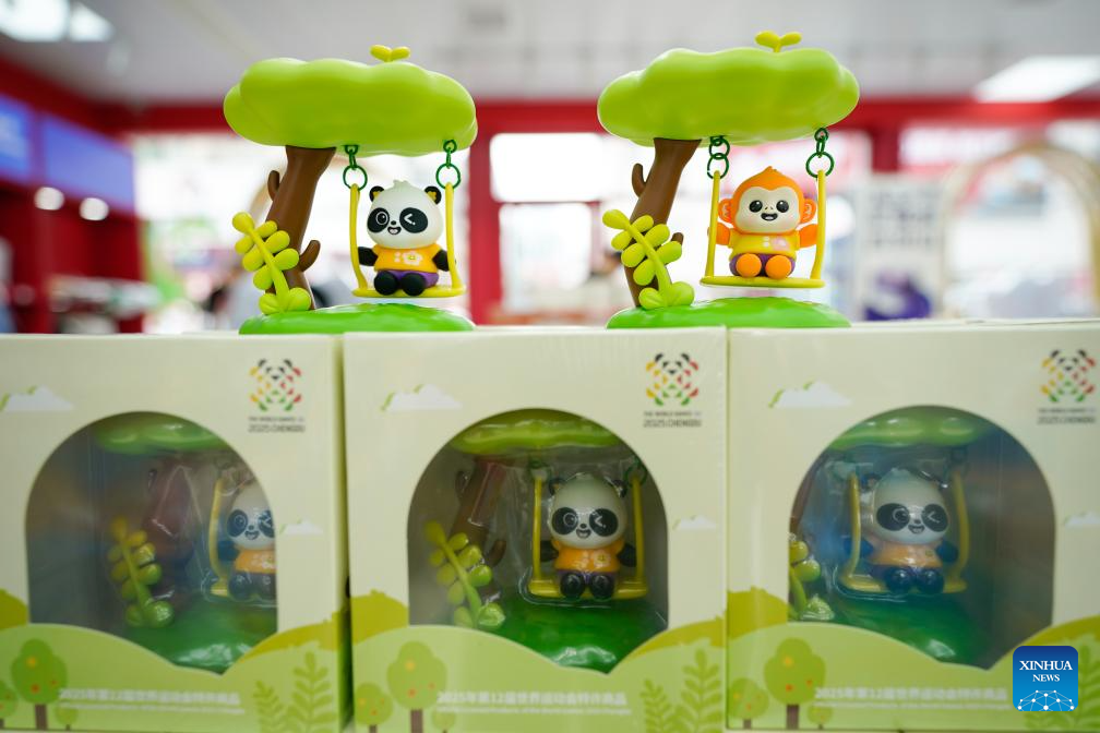 This photo taken on July 8, 2025 shows products on display at an official licensed products store for the World Games 2025 in Chengdu, southwest China's Sichuan Province. The Games hit the 30-day countdown mark today and will be held from August 7 to 17. (Xinhua/Xu Bingjie)