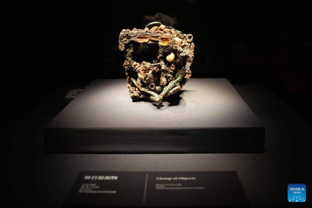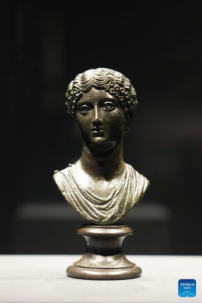 This photo shows an exhibit at the exhibition "Meet Pompeii: The Eternal City" at the Hunan Museum in Changsha, capital of central China's Hunan Province, July 8, 2025. This exhibition showcasing cultural relics from ancient Pompeii opened here on Tuesday. It features more than 130 artifacts, including frescoes, sculptures, and bronze and gold ware, and will run through November 2 this year. Pompeii, situated between Naples and the Amalfi Coast, is a UNESCO World Heritage Site. The ancient city was buried under volcanic ash and pumice during the catastrophic eruption of Mount Vesuvius in the year 79. (Xinhua/Xue Yuge)