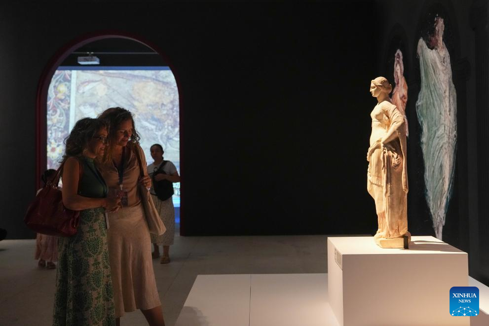 This photo shows the statue of Venus, the patron goddess of Pompeii, at the exhibition "Meet Pompeii: The Eternal City" at the Hunan Museum in Changsha, capital of central China's Hunan Province, July 8, 2025. This exhibition showcasing cultural relics from ancient Pompeii opened here on Tuesday. It features more than 130 artifacts, including frescoes, sculptures, and bronze and gold ware, and will run through November 2 this year. Pompeii, situated between Naples and the Amalfi Coast, is a UNESCO World Heritage Site. The ancient city was buried under volcanic ash and pumice during the catastrophic eruption of Mount Vesuvius in the year 79. (Xinhua/Xue Yuge)