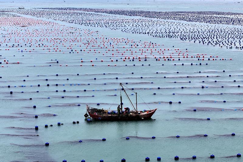 Fishermen operate their boats through waves in a marine ranch of Dinghai bay, Lianjiang county, Fuzhou city, Fujian province, on May 27, 2025. [Photo/Xinhua]