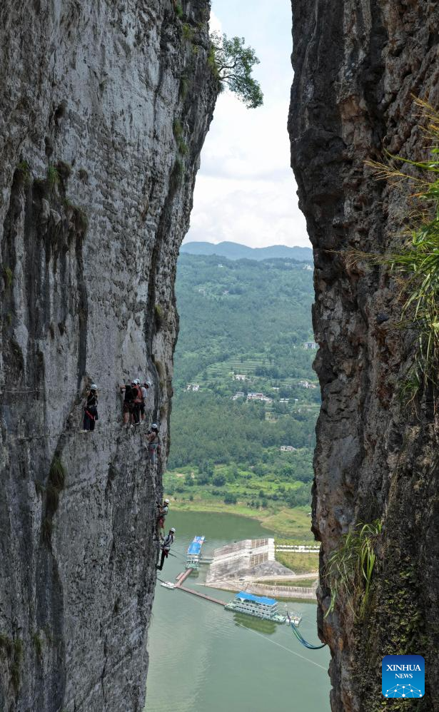 Tourists experience rock climbing at a scenic area in Xintang Township, Enshi City, central China's Hubei Province, July 8, 2025. Taking advantage of the natural resources, local authorities of Enshi Tujia and Miao Autonomous Prefecture have built sports bases for rafting, rock climbing, rappelling, kayaking, paddleboarding, etc. By hosting sports events and inviting teams to organize sports training, the prefecture provides fresh ways for more and more urbanites to experience China's rural landscapes. (Photo by Zhao Jun/Xinhua)
