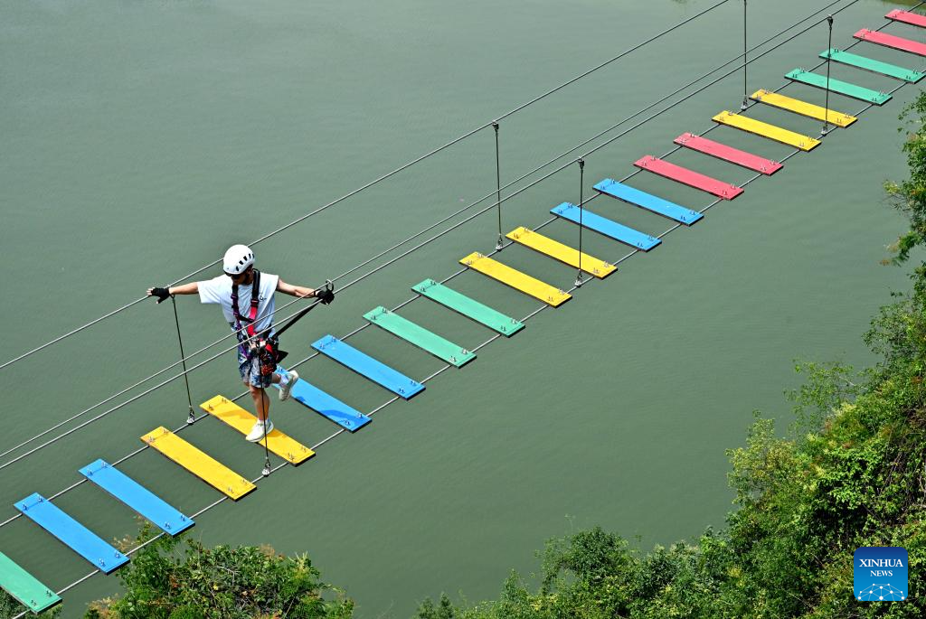 A tourist climbs a ladder at a scenic area in Xintang Township, Enshi City, central China's Hubei Province, July 8, 2025. Taking advantage of the natural resources, local authorities of Enshi Tujia and Miao Autonomous Prefecture have built sports bases for rafting, rock climbing, rappelling, kayaking, paddleboarding, etc. By hosting sports events and inviting teams to organize sports training, the prefecture provides fresh ways for more and more urbanites to experience China's rural landscapes. (Photo by Song Wen/Xinhua)