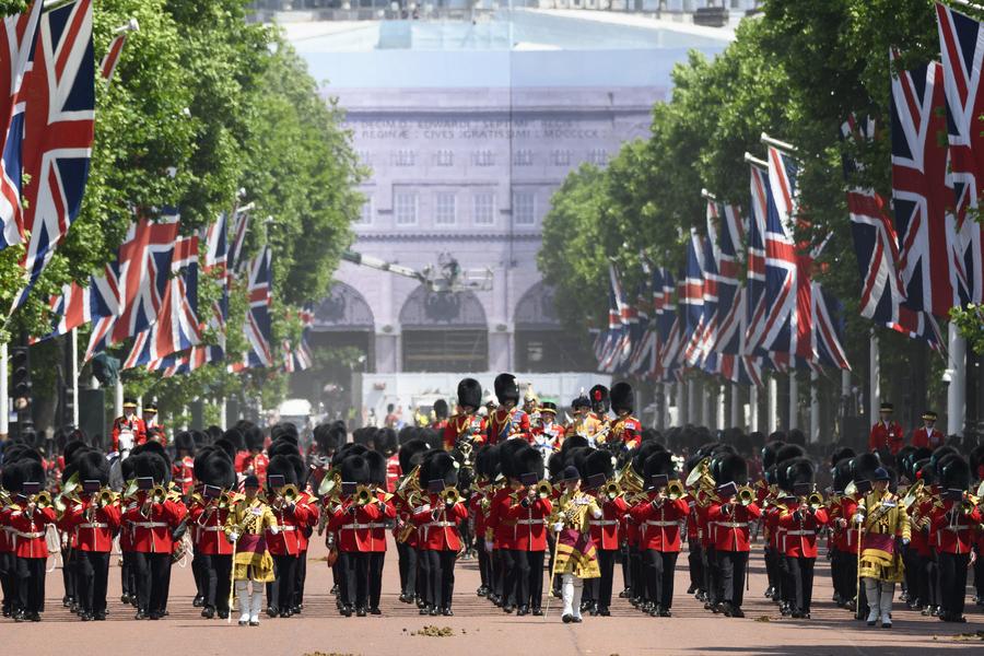 Members of the Household Division march during the Trooping the Colour parade to honour Britain's King Charles III on his official birthday in London, Britain, on June 14, 2025. (Photo by Ray Tang/Xinhua)