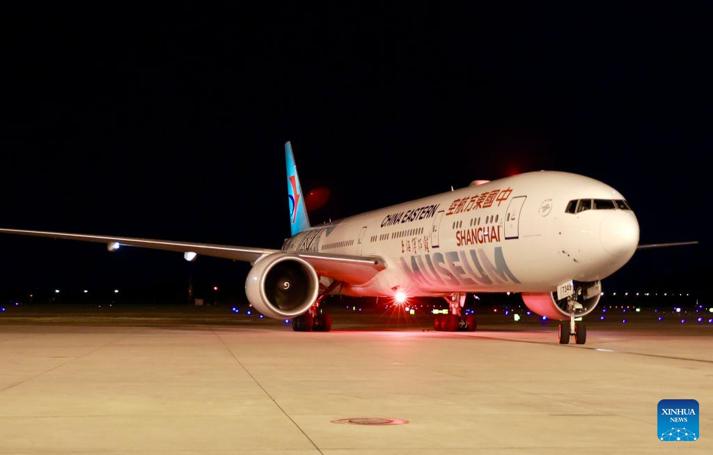 Flight MU845 headed for Paris is set to depart Nanjing Lukou International Airport in Nanjing, east China's Jiangsu Province, late July 8, 2025. China Eastern Airlines inaugurated a direct flight route between Nanjing and Paris on Wednesday morning, connecting the capital of Jiangsu Province -- one of China's economic powerhouses -- with the European destination. (Photo by Fang Tianxiang/Xinhua)