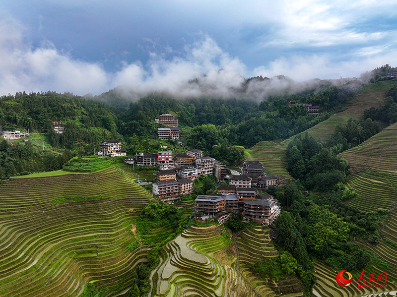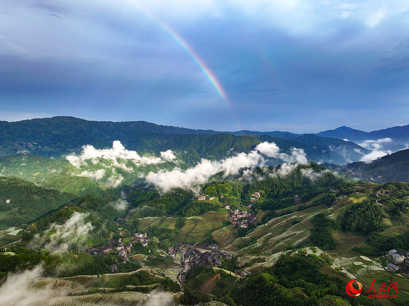 As the summer rain begins to ease, mist still lingers above the Longji Rice Terraces in Longsheng Ge Autonomous County, Guilin city, south China's Guangxi Zhuang Autonomous Region. Sunlight pierces through the clouds, casting a rainbow across the layered terraces. Wisps of cloud swirl like silk ribbons around the mountains, creating a magnificent scene.