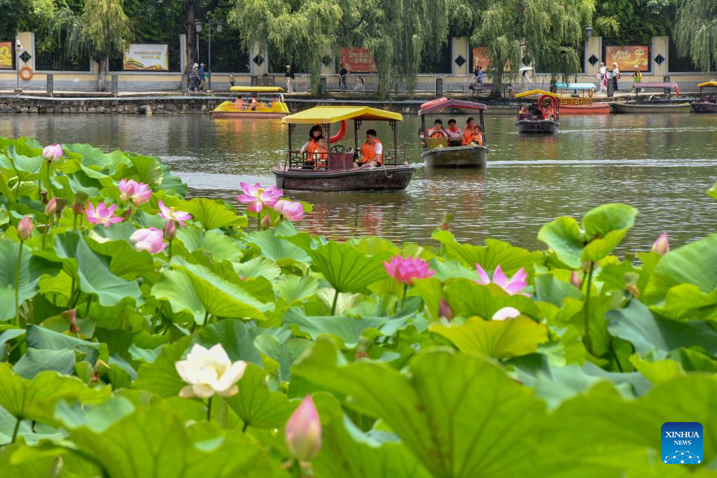 Tourists take sightseeing boats at Daguan Park in Kunming, southwest China's Yunnan Province on July 9, 2025. (Xinhua/Peng Yikai)