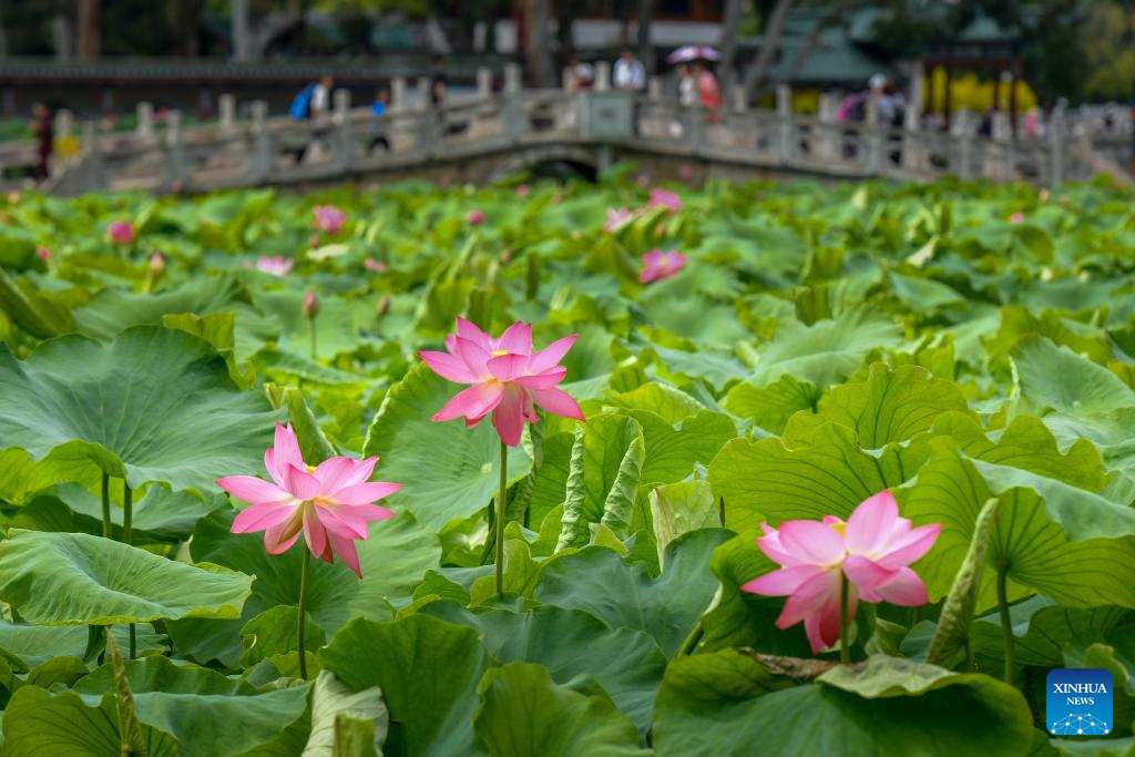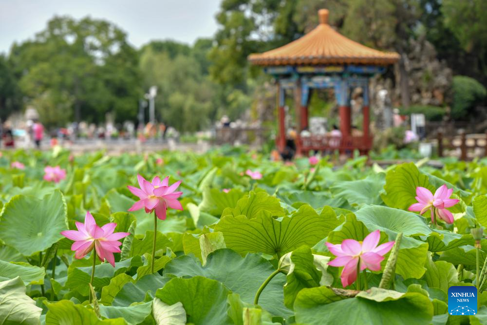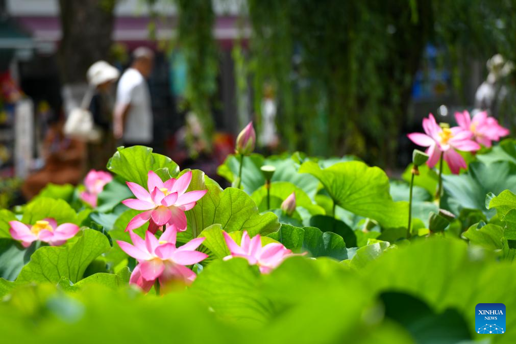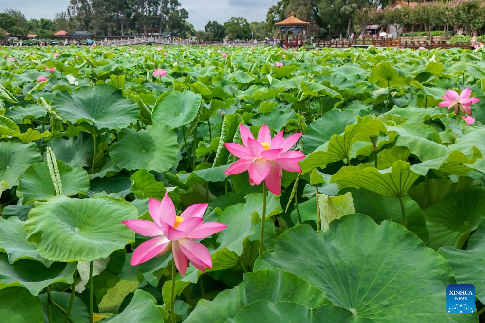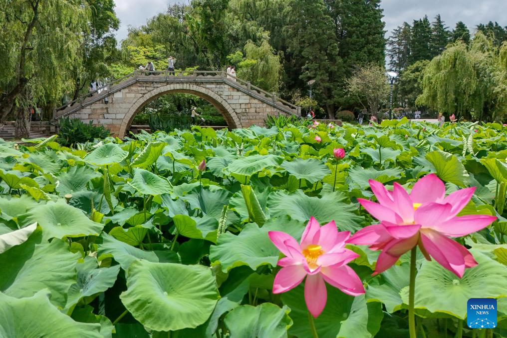 This photo taken on July 9, 2025 shows lotus flowers at Daguan Park in Kunming, southwest China's Yunnan Province. (Xinhua/Peng Yikai)