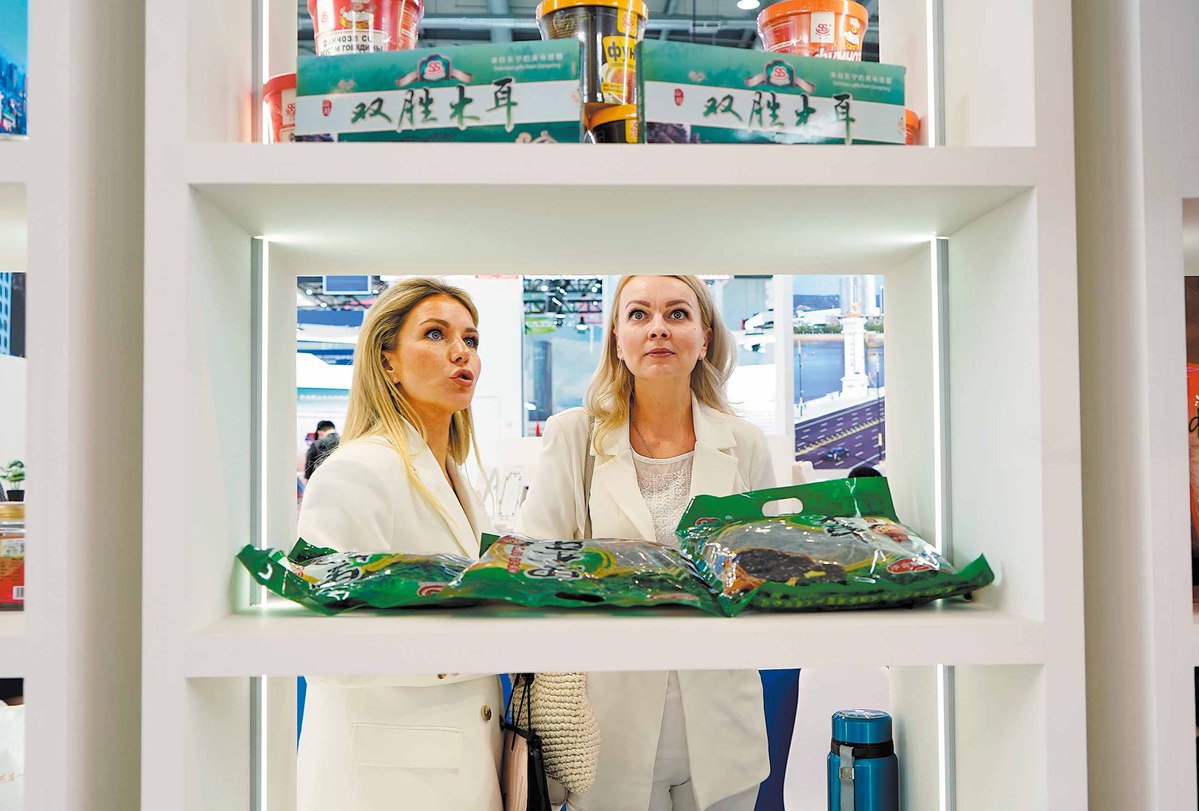 Visitors look at Chinese agricultural products during the ninth China-Russia Expo in Yekaterinburg, Russia. LIU KAI/XINHUA