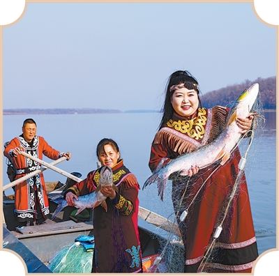 People of the Hezhe ethnic group showcase fish they caught in Raohe county, Shuangyashan city, northeast China's Heilongjiang Province. (Photo/Xu Yi)