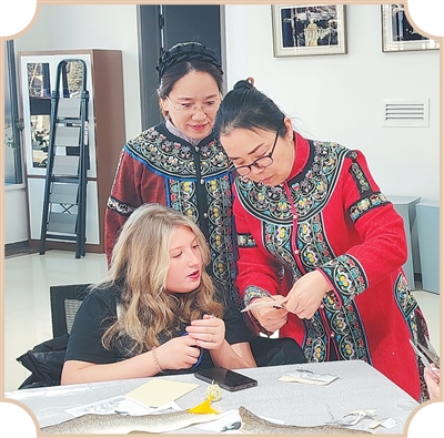 You Xuesong (1st R) instructs a Russian tourist to make a fish-skin painting in Raohe county, Shuangyashan city, northeast China's Heilongjiang Province. (Photo/Shi Qiao)