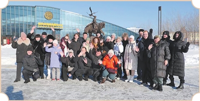 Russian tourists pose for a group photo at the Sipai Hezhe scenic area in Raohe county, Shuangyashan city, northeast China's Heilongjiang Province. (Photo courtesy of the media convergence center of Raohe county)