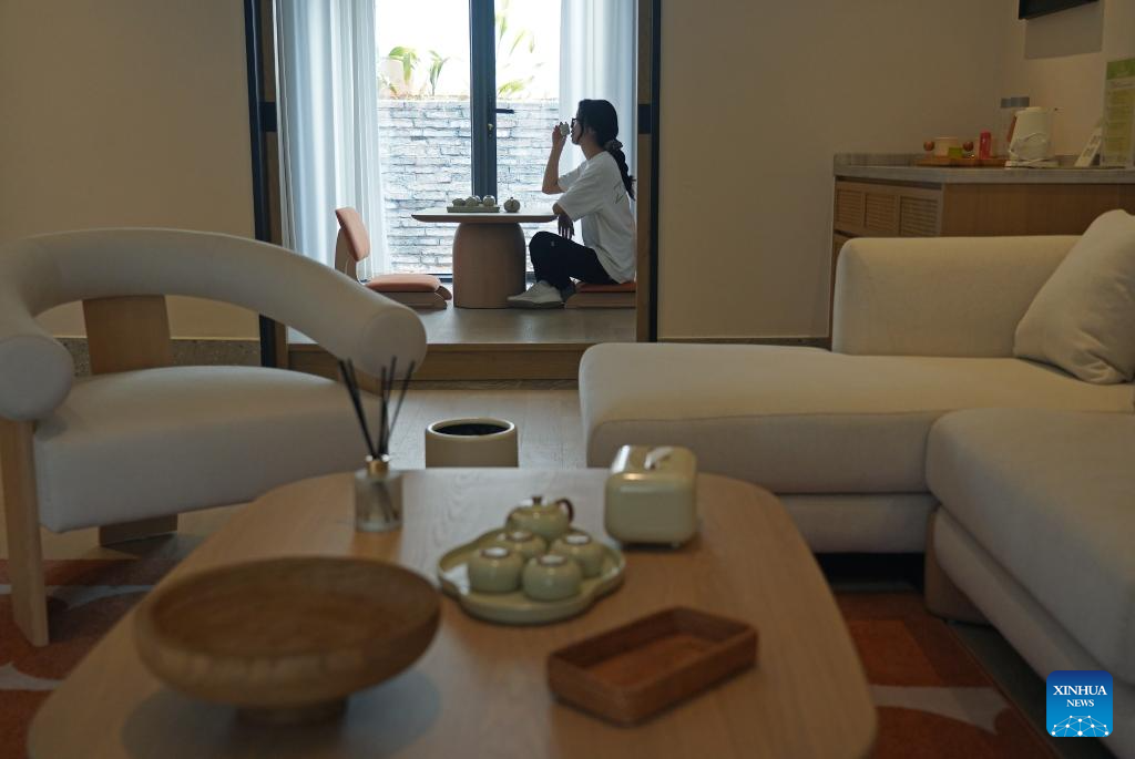 A tourist rests at a homestay in Diaoyuan Ancient Village of Ji'an, east China's Jiangxi Province, July 9, 2025. Tucked into the undulating hills of Ji'an City in east China's Jiangxi Province, Diaoyuan Village has stood for over 1,100 years -- the layout from above bearing a striking resemblance to a Taoist Tai Chi diagram.