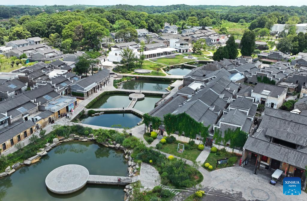 Tourist visit Diaoyuan Ancient Village of Ji'an, east China's Jiangxi Province, July 9, 2025. Tucked into the undulating hills of Ji'an City in east China's Jiangxi Province, Diaoyuan Village has stood for over 1,100 years -- the layout from above bearing a striking resemblance to a Taoist Tai Chi diagram.