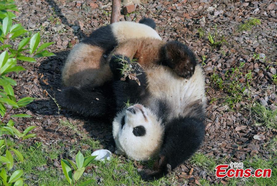 Photo taken on July 10, 2025 shows a playful giant panda at the Chengdu Research Base of Giant Panda Breeding in southwest China's Sichuan Province. (Photo/China News Service)