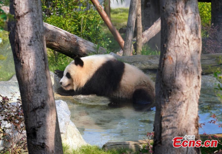 A giant panda cools off in the pool at the Chengdu Research Base of Giant Panda Breeding in southwest China's Sichuan Province on July 10, 2025. (Photo/China News Service)