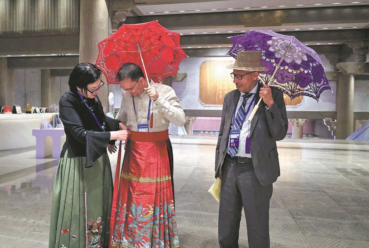 A participant of the 11th Nishan Forum on World Civilizations tries on a mamianqun, or horse-face skirt in Qufu, Shandong province, on Wednesday. ZHAO XIAO/CHINA NEWS SERVICE