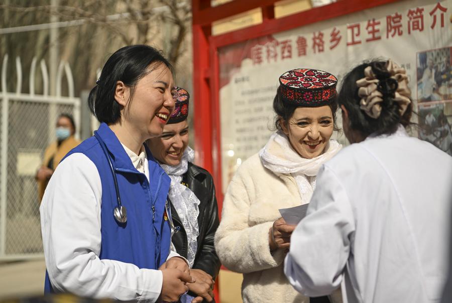 A doctor from Shenzhen talks with villagers and local medical staff at Kukexiluge health center in Kukexiluge Township, Taxkorgan Tajik Autonomous County, northwest China's Xinjiang Uygur Autonomous Region, March 24, 2025. (Xinhua/Hu Huhu)