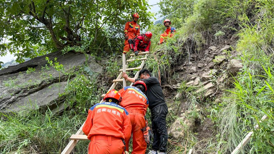 Rescuers build a path for evacuation at the site of a mudslide at the Gyirong Port area in Gyirong Township of Xigaze, southwest China's Xizang Autonomous Region, July 8, 2025. (Photo by Xu Dafu/Xinhua)