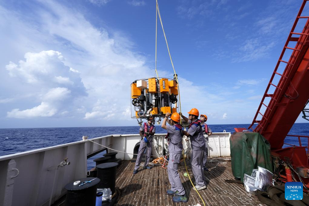 Researchers hoist an autonomous underwater vehicle into the sea in the northern waters of the South China Sea, July 8, 2025. (Xinhua/Zhang Jiansong)