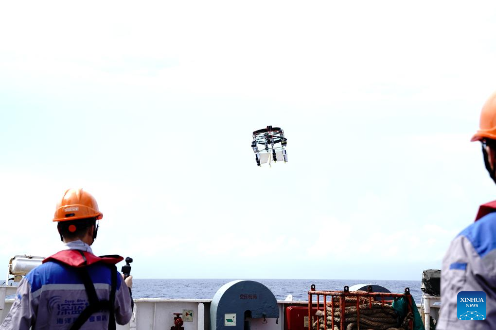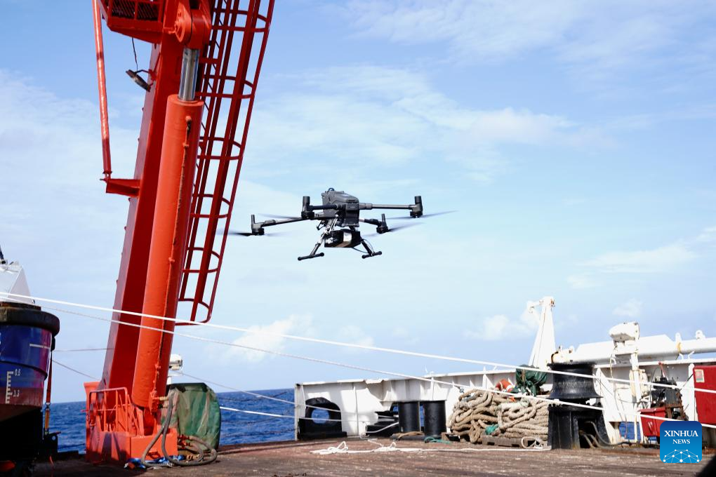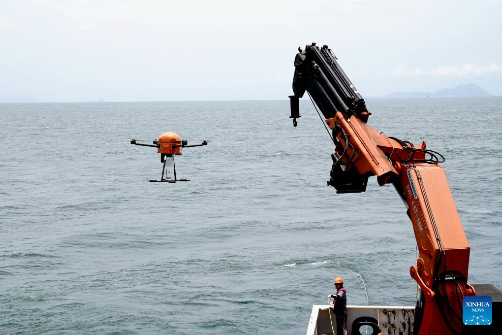 A cross-domain robot takes off from the "Xiangyanghong 10" to conduct scientific research in the northern waters of the South China Sea, July 8, 2025. (Xinhua/Zhang Jiansong)