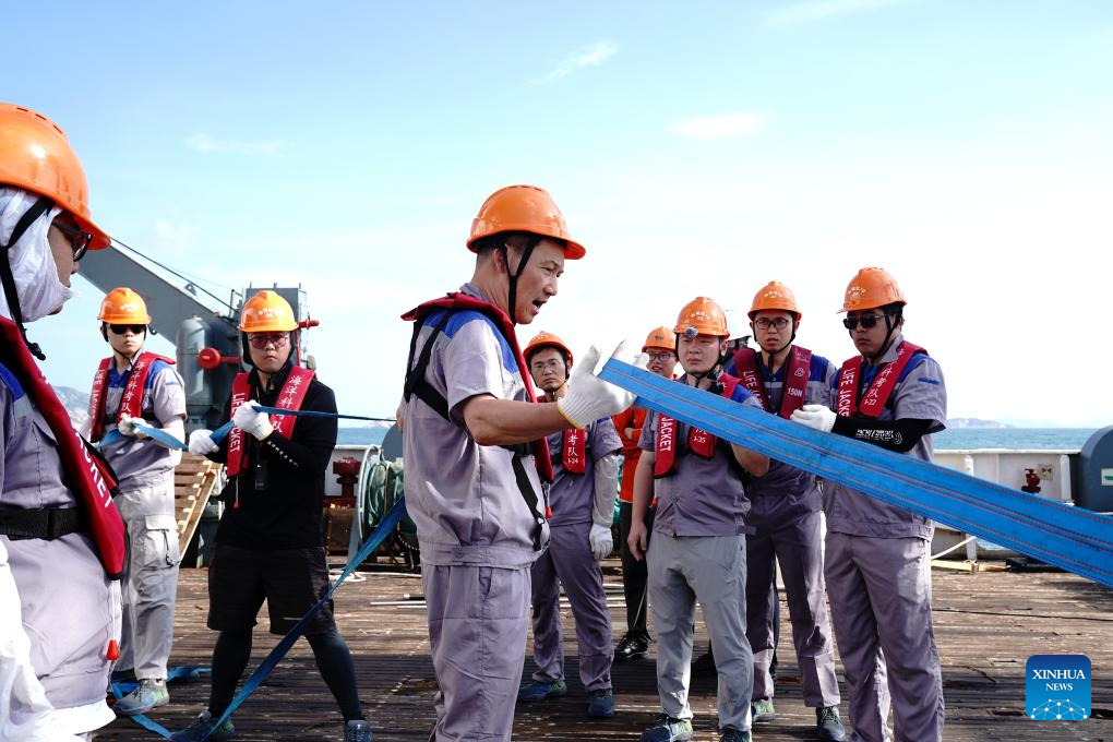 Chief scientist of the "Innovative Integrated Intelligent Systems Expedition" Lin Jian (C), also dean and chair professor of the Advanced Institute for Ocean Research at Southern University of Science and Technology, supervises operations of scientific research aboard the "Xiangyanghong 10" in the northern waters of the South China Sea, July 8, 2025. (Xinhua/Zhang Jiansong)