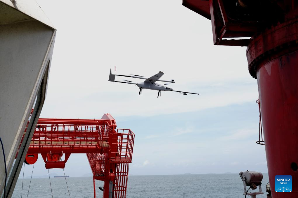 A thermal-imaging surveillance unmanned aerial vehicle (UAV) takes off from the "Xiangyanghong 10" to conduct scientific research in the northern waters of the South China Sea, July 8, 2025. (Xinhua/Zhang Jiansong)