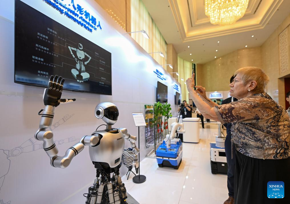 A guest operates a robot during the 2025 Shanghai Cooperation Organization (SCO) Digital Economy Forum in north China's Tianjin, July 11, 2025. Themed "New Bonds in the Digital Economy, New Horizons for Cooperation," the forum was held here Friday. (Xinhua/Li Ran)