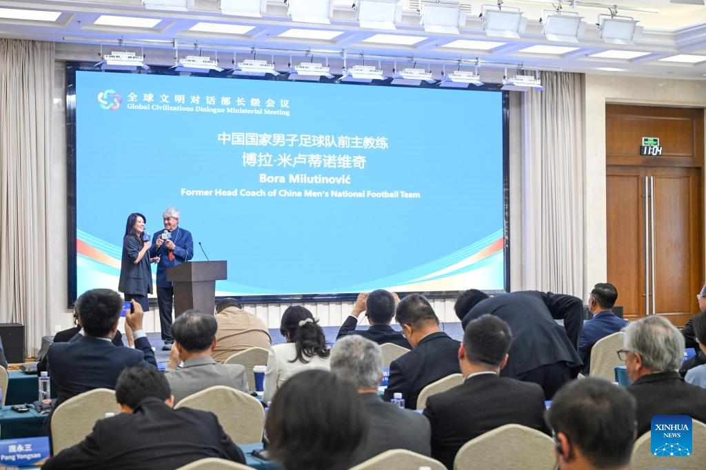 Bora Milutinovic, former coach of the Chinese national football team, communicates with Yang Yang, Winter Olympic champion and vice president of the World Anti-Doping Agency, at the sub-forum themed on "Inter-Civilization Exchanges and Mutual Learning: Understanding and Friendship Among Peoples" during the Global Civilizations Dialogue Ministerial Meeting in Beijing, capital of China, July 11, 2025. Six parallel sub-forums of the Global Civilizations Dialogue Ministerial Meeting were held here on Friday. (Xinhua/Chen Yehua)