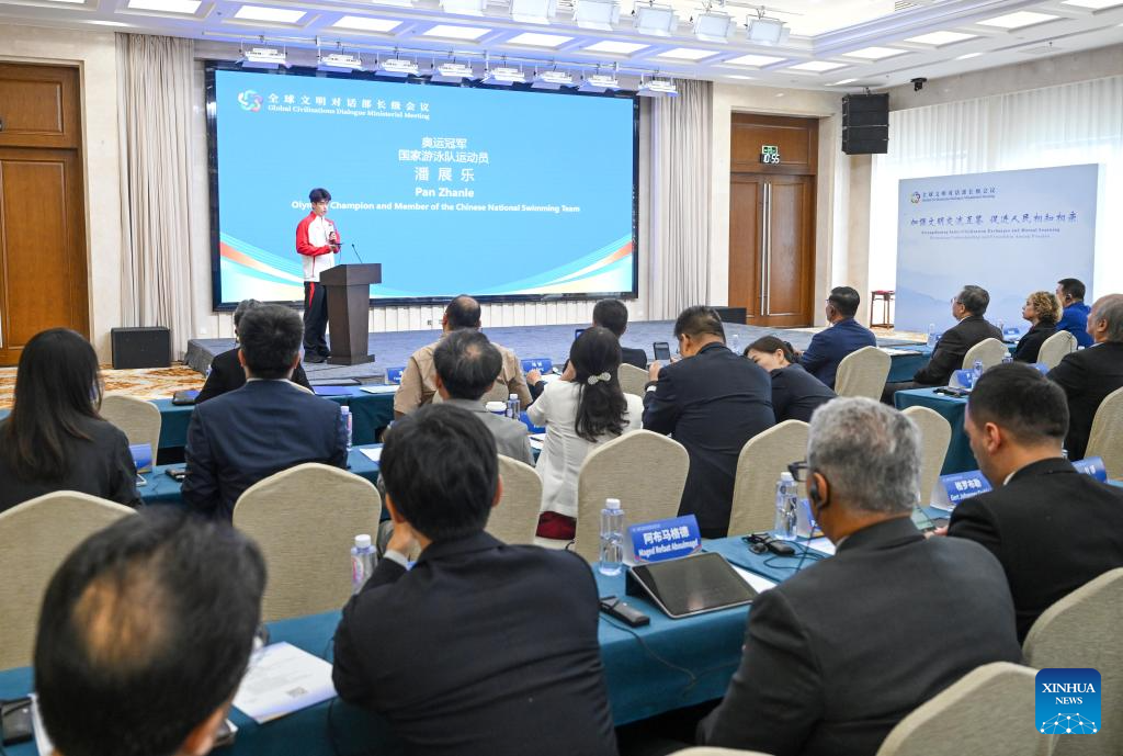 Pan Zhanle, Olympic champion and member of the Chinese national swimming team, speaks at the sub-forum themed on "Inter-Civilization Exchanges and Mutual Learning: Understanding and Friendship Among Peoples" during the Global Civilizations Dialogue Ministerial Meeting in Beijing, capital of China, July 11, 2025. Six parallel sub-forums of the Global Civilizations Dialogue Ministerial Meeting were held here on Friday. (Xinhua/Chen Yehua)