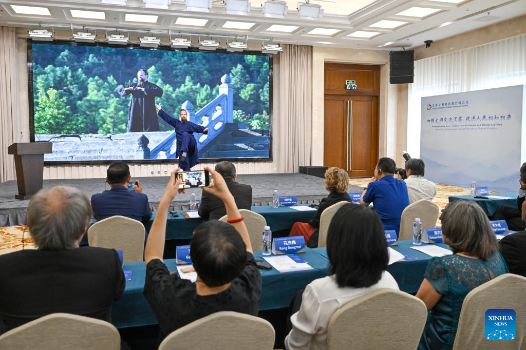 Jake Pinnick, American Wushu athlete and a 16th-generation disciple of the Wudang Sanfeng martial arts lineage, performs Tai Chi at the sub-forum themed on "Inter-Civilization Exchanges and Mutual Learning: Understanding and Friendship Among Peoples" during the Global Civilizations Dialogue Ministerial Meeting in Beijing, capital of China, July 11, 2025. Six parallel sub-forums of the Global Civilizations Dialogue Ministerial Meeting were held here on Friday. (Xinhua/Chen Yehua)