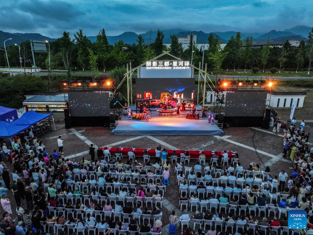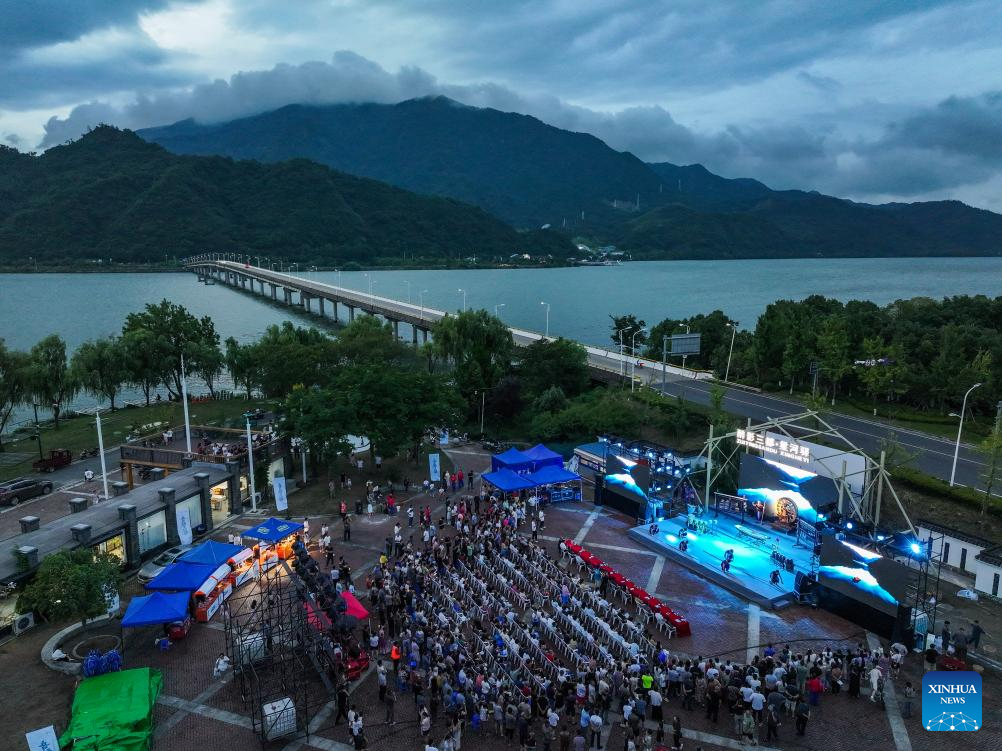 A drone photo taken on July 11, 2025 shows a scene of a musical performance during the village summer musical season in Sandu Township, Jiande City, east China's Zhejiang Province. (Xinhua/Xu Yu)