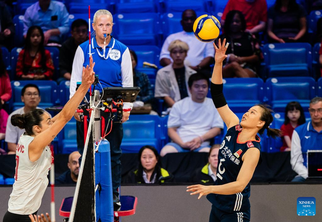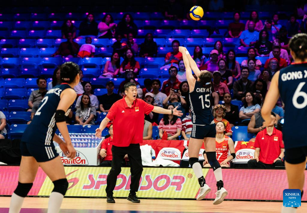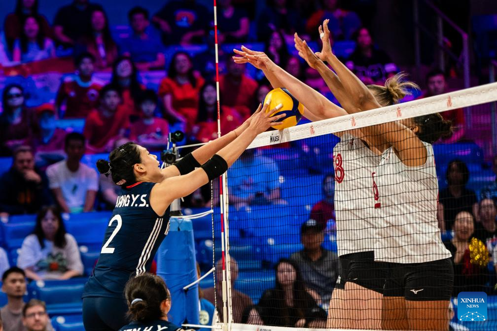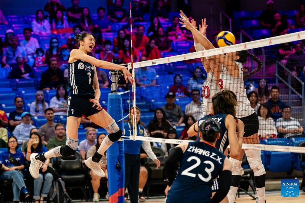 Gong Xiangyu (R) of China spikes the ball during the match between Canada and China at the Women's Volleyball Nations League (VNL) 2025 in Arlington, the United States, July 11, 2025. (Photo by Chen Chen/Xinhua)