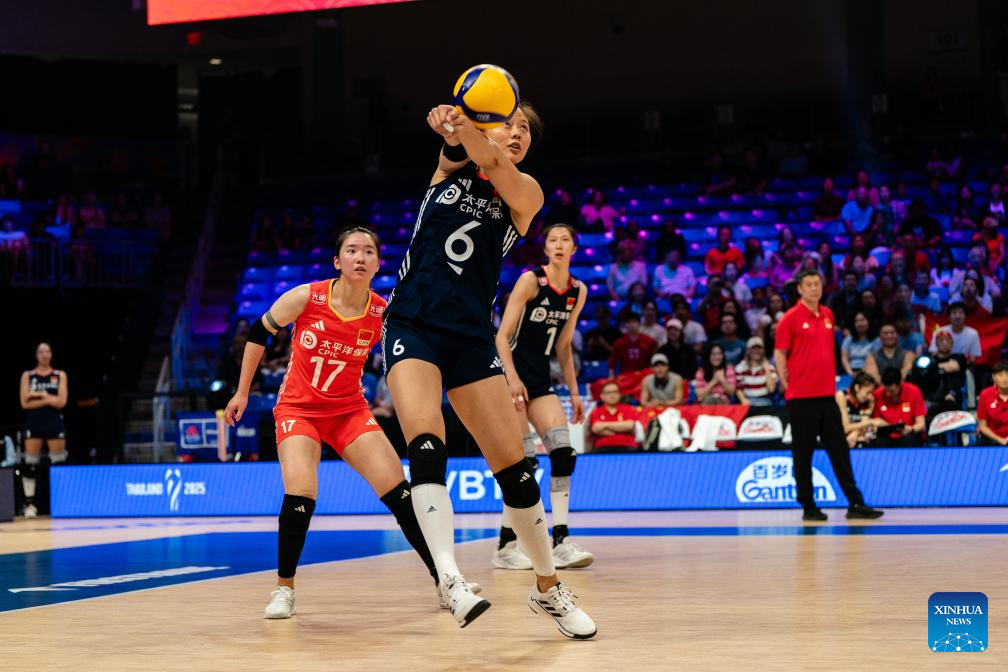 Zhuang Yushan (L) of China passes the ball during the match between Canada and China at the Women's Volleyball Nations League (VNL) 2025 in Arlington, the United States, July 11, 2025. (Photo by Chen Chen/Xinhua)