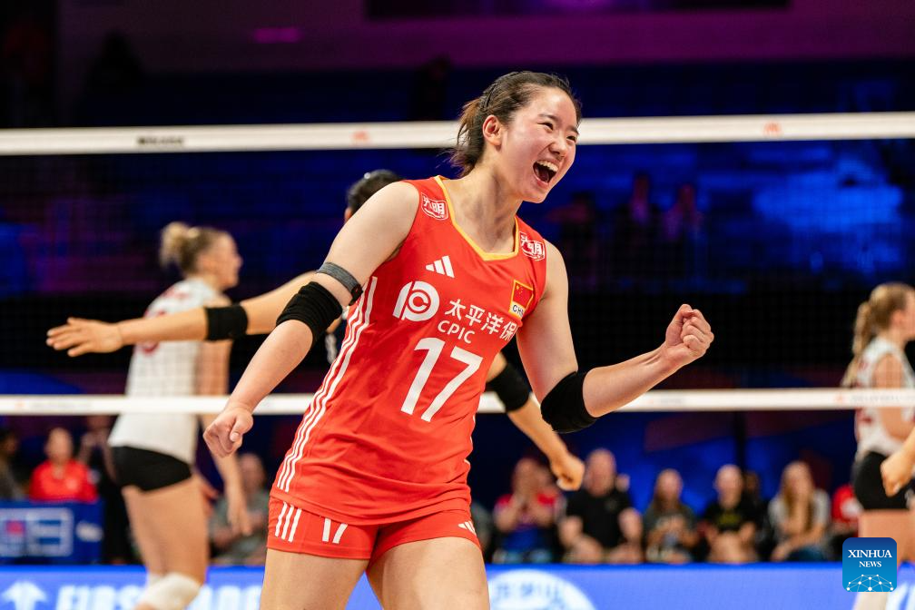 Ni Feifan of China celebrates scoring during the match between Canada and China at the Women's Volleyball Nations League (VNL) 2025 in Arlington, the United States, July 11, 2025. (Photo by Chen Chen/Xinhua)