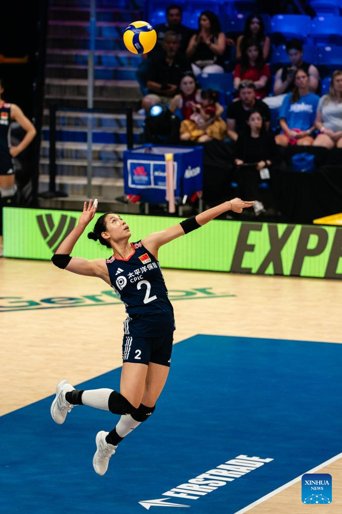 Gong Xiangyu (front) of China passes the ball during the match between Canada and China at the Women's Volleyball Nations League (VNL) 2025 in Arlington, the United States, July 11, 2025. (Photo by Chen Chen/Xinhua)