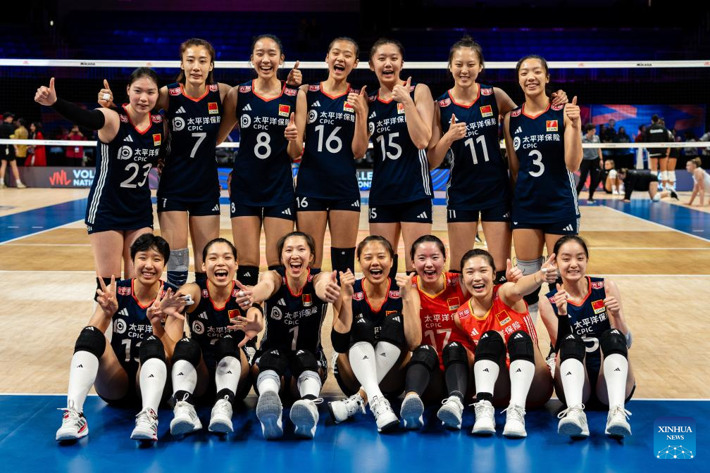 Players of China pose for photos after the match between Canada and China at the Women's Volleyball Nations League (VNL) 2025 in Arlington, the United States, July 11, 2025. (Photo by Chen Chen/Xinhua)