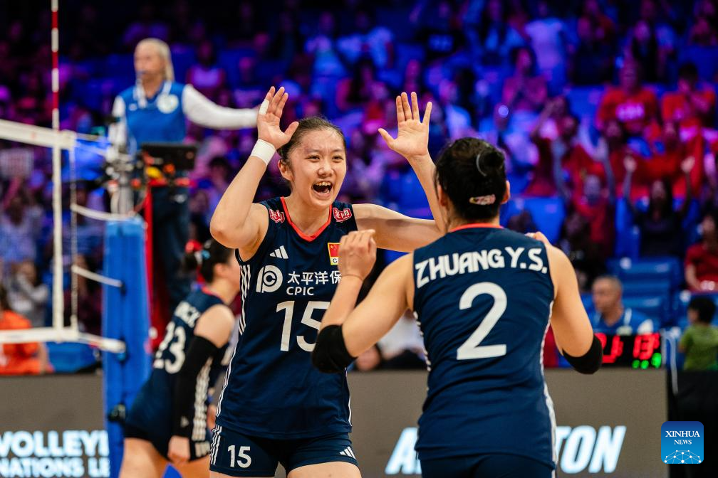 Chen Houyu (L) of China celebrates scoring with her teammate Zhuang Yushan during the match between Canada and China at the Women's Volleyball Nations League (VNL) 2025 in Arlington, the United States, July 11, 2025. (Photo by Chen Chen/Xinhua)