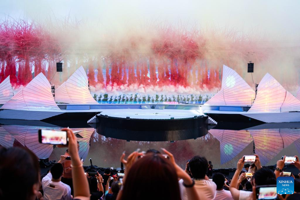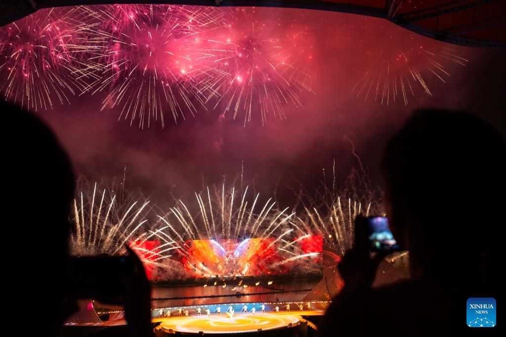 This photo taken on July 12, 2025 shows a scene of a creative fireworks show in Liuyang City, central China's Hunan Province. Liuyang, a small city known as China's "fireworks capital," has organized 26 creative fireworks events in the first half of 2025. These events have attracted over 1.5 million tourists in total, stimulating consumer spending of nearly 4 billion yuan (about 558 million U.S. dollars). (Xinhua/Chen Sihan)