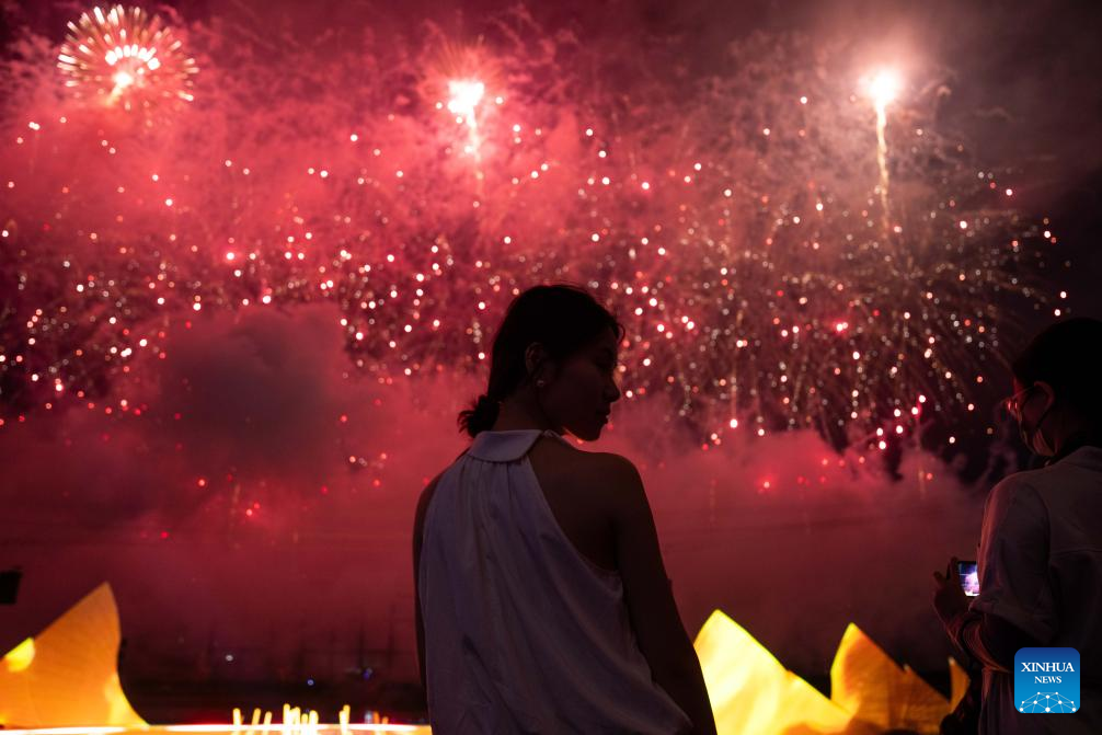 Tourists take photos during a creative fireworks show in Liuyang City, central China's Hunan Province, July 12, 2025. Liuyang, a small city known as China's "fireworks capital," has organized 26 creative fireworks events in the first half of 2025. These events have attracted over 1.5 million tourists in total, stimulating consumer spending of nearly 4 billion yuan (about 558 million U.S. dollars). (Xinhua/Chen Sihan)
