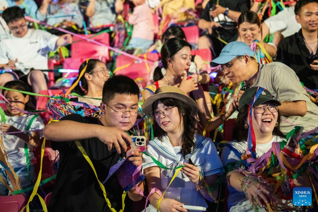 Tourists are seen during a creative fireworks show in Liuyang City, central China's Hunan Province, July 12, 2025. Liuyang, a small city known as China's "fireworks capital," has organized 26 creative fireworks events in the first half of 2025. These events have attracted over 1.5 million tourists in total, stimulating consumer spending of nearly 4 billion yuan (about 558 million U.S. dollars). (Xinhua/Chen Sihan)
