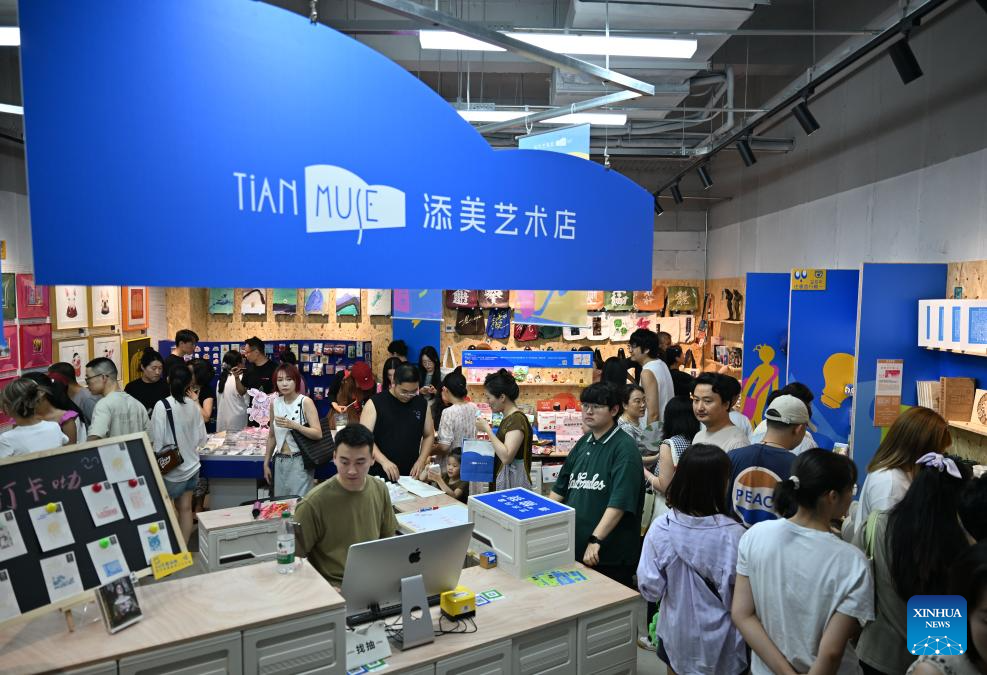 People choose commodities at a store of the Tianjin Academy of Fine Arts Art Block in north China's Tianjin, July 12, 2025. The art block, which opened to the public recently, was built with the support of Tianjin Academy of Fine Arts. It is Tianjin's first urban renewal program which combines distinct four functions in one: urban block, community, scenic area, as well as campus. (Xinhua/Sun Fanyue)