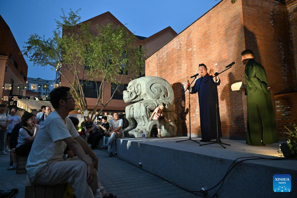 Cross-talk performers are seen at the Tianjin Academy of Fine Arts Art Block in north China's Tianjin, July 12, 2025. The art block, which opened to the public recently, was built with the support of Tianjin Academy of Fine Arts. It is Tianjin's first urban renewal program which combines distinct four functions in one: urban block, community, scenic area, as well as campus. (Xinhua/Sun Fanyue)