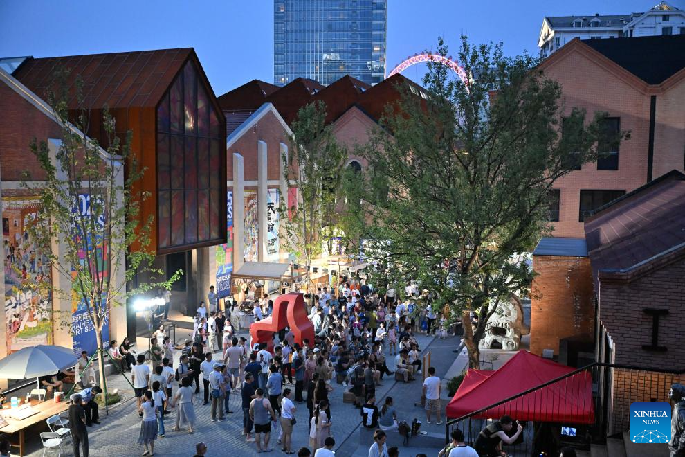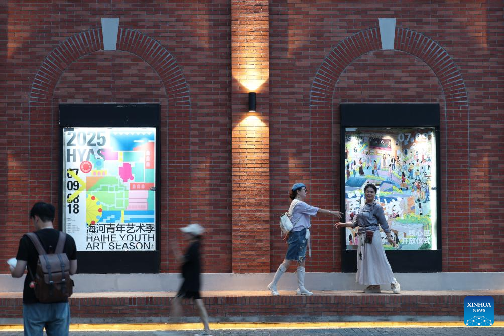 People are seen at the Tianjin Academy of Fine Arts Art Block in north China's Tianjin, July 13, 2025. The art block, which opened to the public recently, was built with the support of Tianjin Academy of Fine Arts. It is Tianjin's first urban renewal program which combines distinct four functions in one: urban block, community, scenic area, as well as campus. (Xinhua/Li Ran)