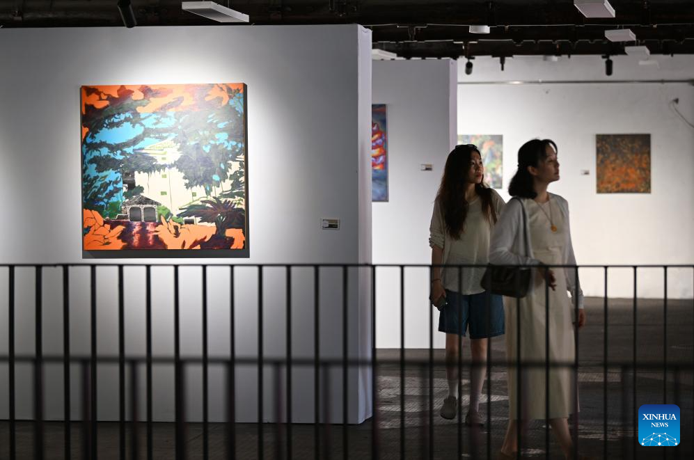 People watch artworks at an exhibition held at the Tianjin Academy of Fine Arts Art Block in north China's Tianjin, July 13, 2025. The art block, which opened to the public recently, was built with the support of Tianjin Academy of Fine Arts. It is Tianjin's first urban renewal program which combines distinct four functions in one: urban block, community, scenic area, as well as campus. (Xinhua/Li Ran)