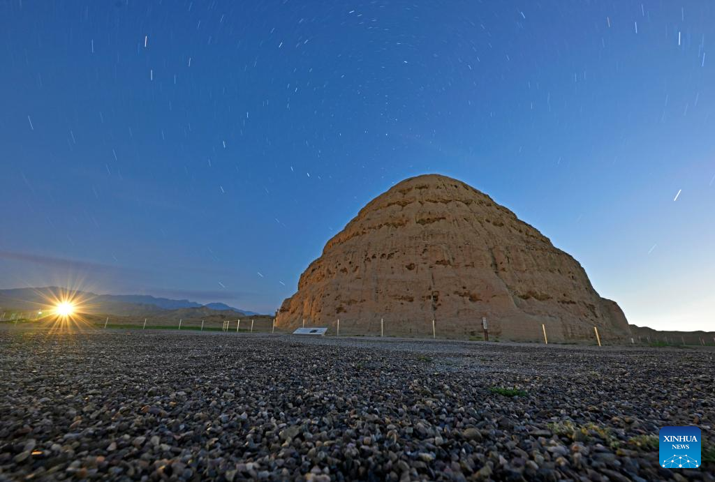 This photo taken on July 10, 2025 shows a Xixia imperial tomb under the stars in Yinchuan, northwest China's Ningxia Hui Autonomous Region.China's Xixia Imperial Tombs were officially added to the UNESCO World Heritage List on Friday during the 47th session of the World Heritage Committee held in Paris, France.The inscription brings the total number of World Heritage sites in China to 60. (Xinhua/Yang Zhisen)