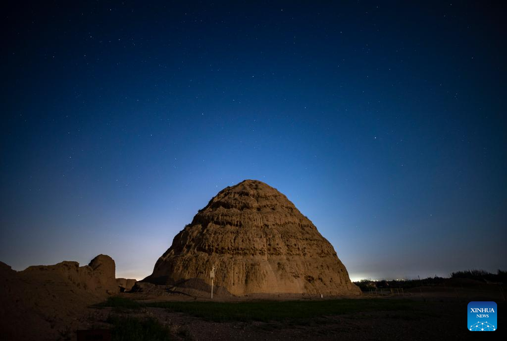 This photo taken on July 10, 2025 shows a Xixia imperial tomb under the stars in Yinchuan, northwest China's Ningxia Hui Autonomous Region.China's Xixia Imperial Tombs were officially added to the UNESCO World Heritage List on Friday during the 47th session of the World Heritage Committee held in Paris, France.The inscription brings the total number of World Heritage sites in China to 60. (Xinhua/Wang Peng)